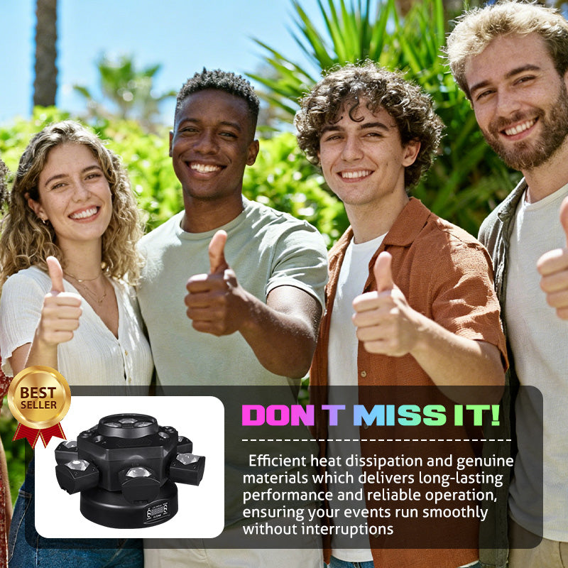 DYNAMISCHES SECHSARMIGES DESIGN – Verfügt über sechs unabhängig voneinander bewegliche Arme, die jeweils einen leistungsstarken Lichtstrahl projizieren. Dies sorgt für atemberaubende, raumfüllende Effekte und energiegeladene Lichtshows, die jedes Publikum begeistern und die Atmosphäre Ihrer Veranstaltung unterstreichen.