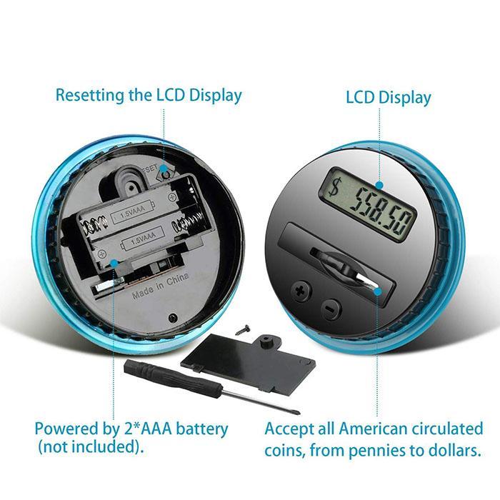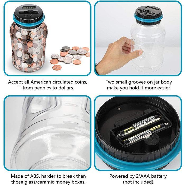 aus ABS-Material (zerbrechungsresistenter als Glas- oder Keramiksparbüchsen), mit zwei kleinen Rillen zum einfachen Halten, klares LCD-Display für genaue Anzeige des Gesamtbetrags jeder Einzahlung