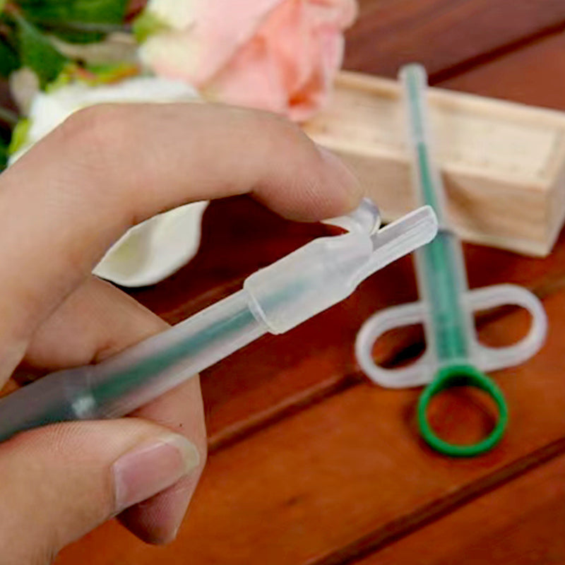 - 【Pillen oder Kapseln】: Füllen Sie den Medikamentendosierer mit Trinkwasser, klemmen Sie die Pillen oder Kapseln ein, öffnen Sie das Maul des Haustieres und fixieren Sie es, zielen Sie auf die Kehle und drücken Sie den Kolben heftig.