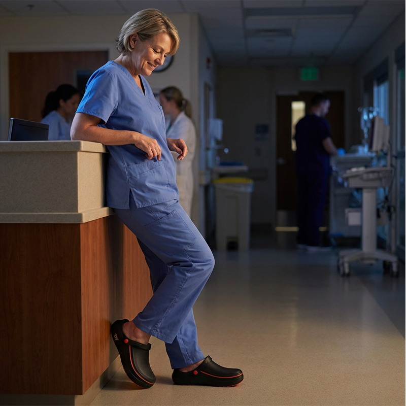 ÖL- UND WASSERDICHTES OBERMATERIAL – Hält Ihre Füße trocken und schützt vor Verschüttungen in unordentlichen Umgebungen wie Küchen oder Kliniken. Die porenlose Oberfläche sorgt dafür, dass Flüssigkeiten abperlen, und gewährleistet Komfort und Hygiene während Ihrer gesamten Schicht.