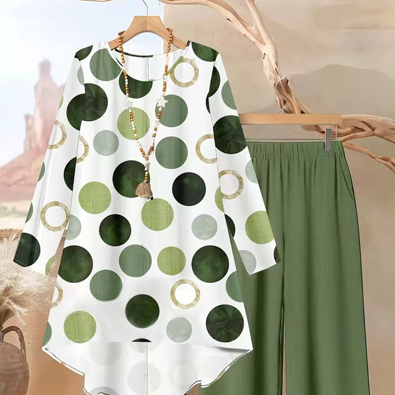Damen-2-Teiliges Set: Asymmetrisches Oberteil + Hose – Vintage-Print & ganztägiger Komfort